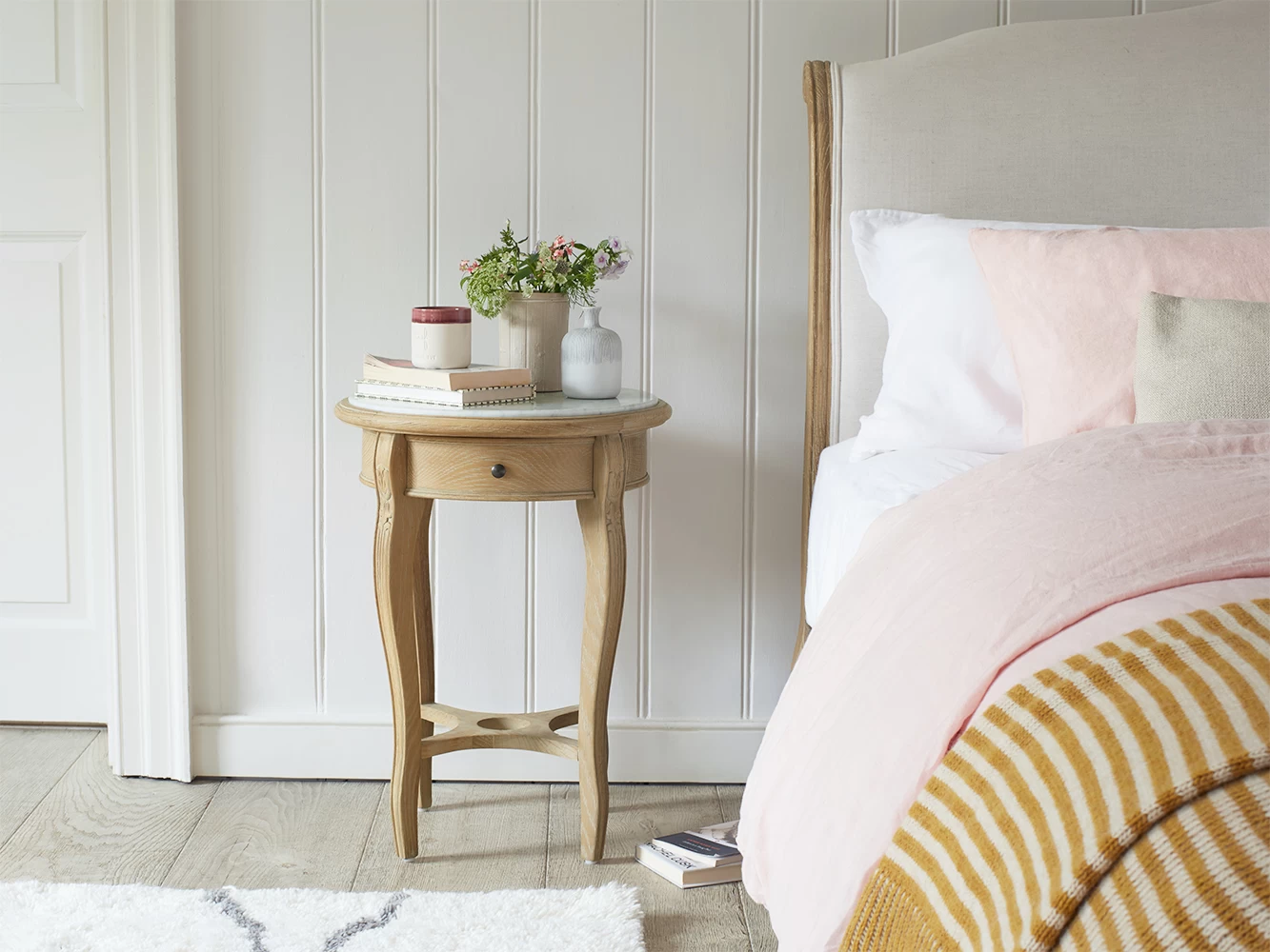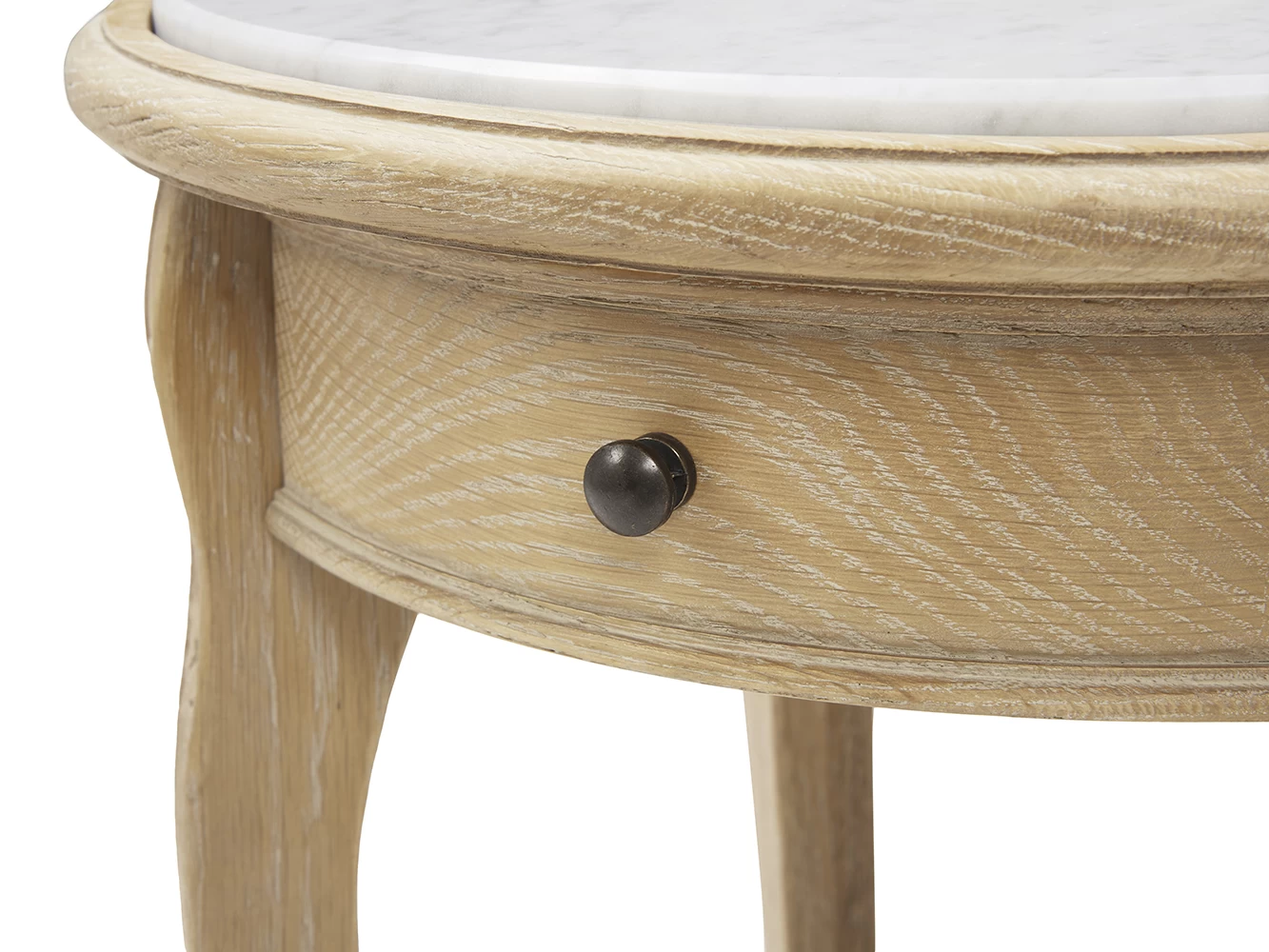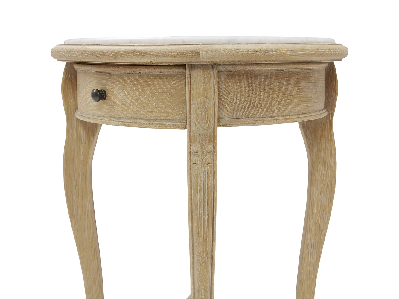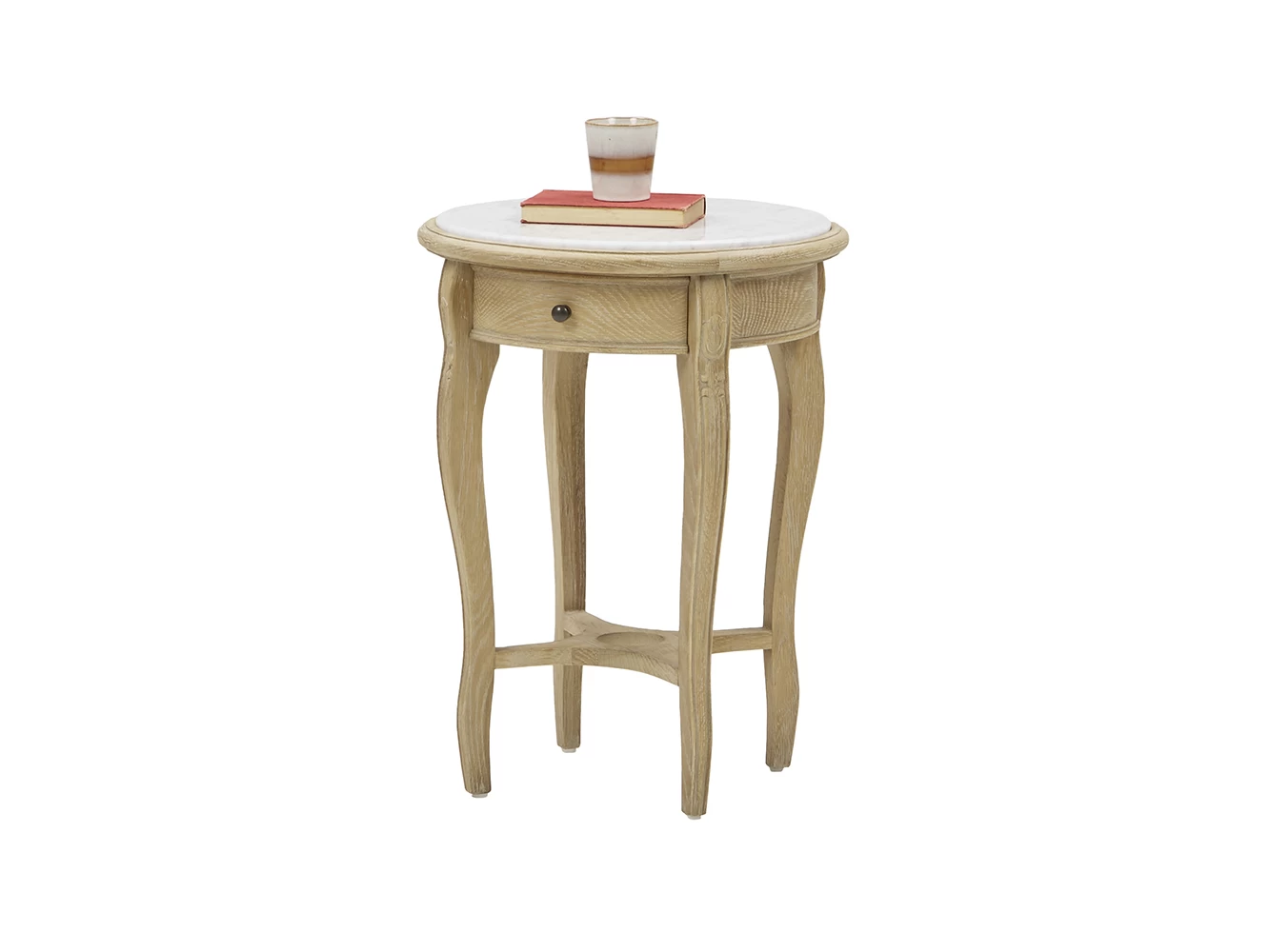 The cloudy marble which tops off this light oak side table is soft on the eye and solid in nature. Nice combo, n’est-ce pas?