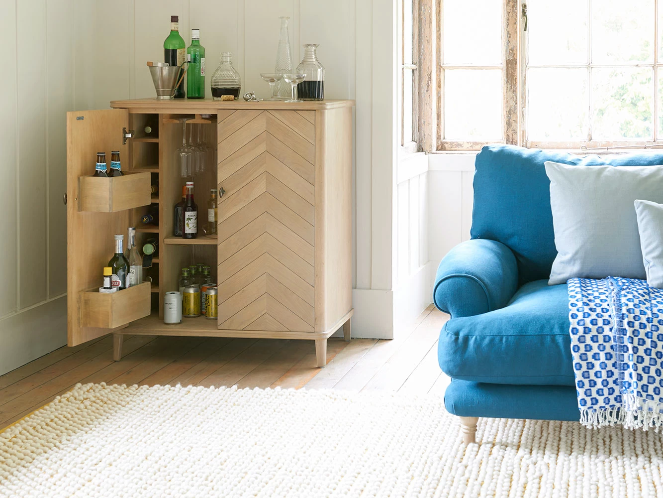 Solid oak and hand-laid parquet. Now that’s a drinks cabinet! Just add your favourite firewater.