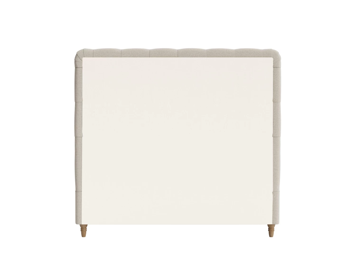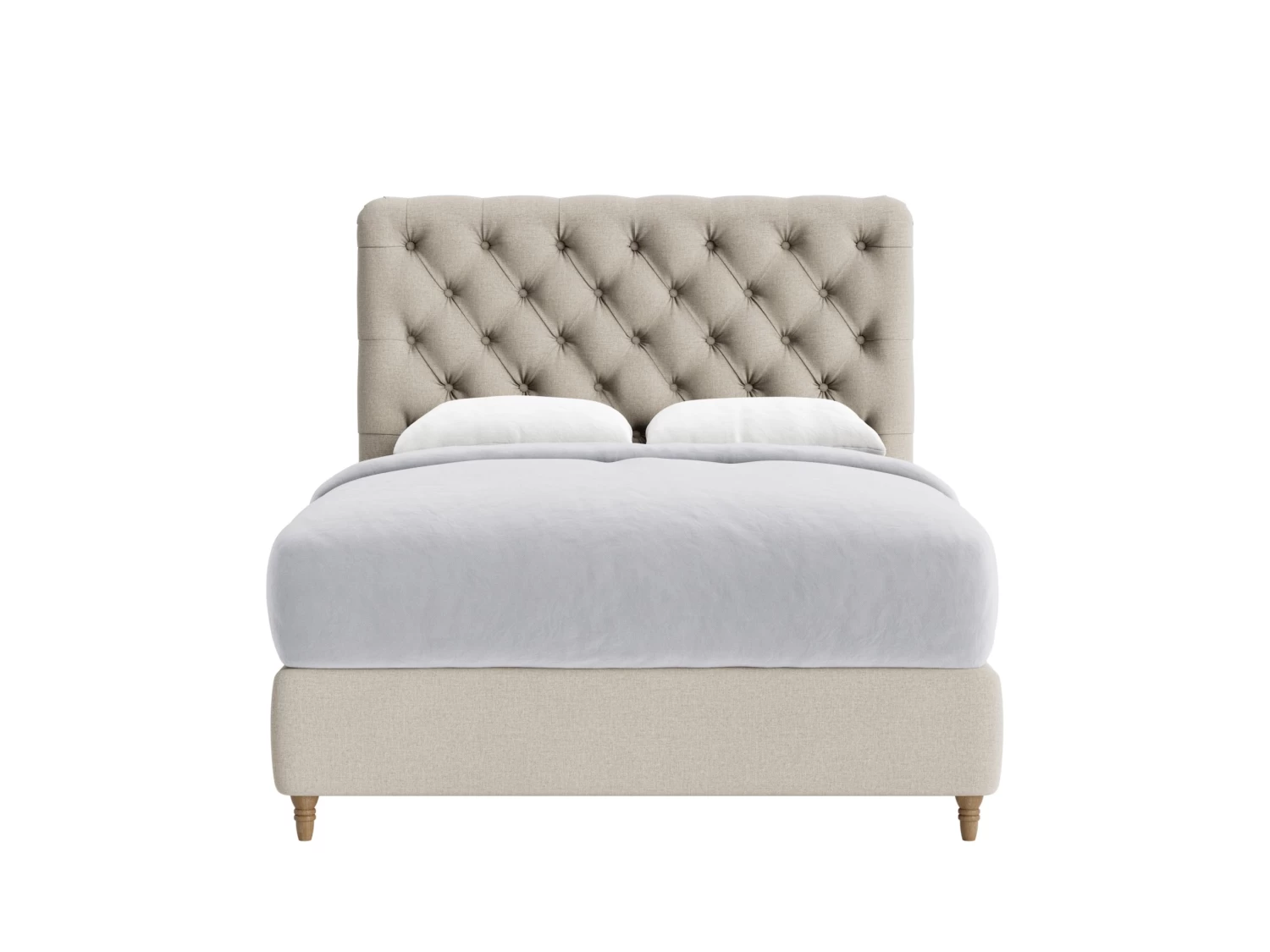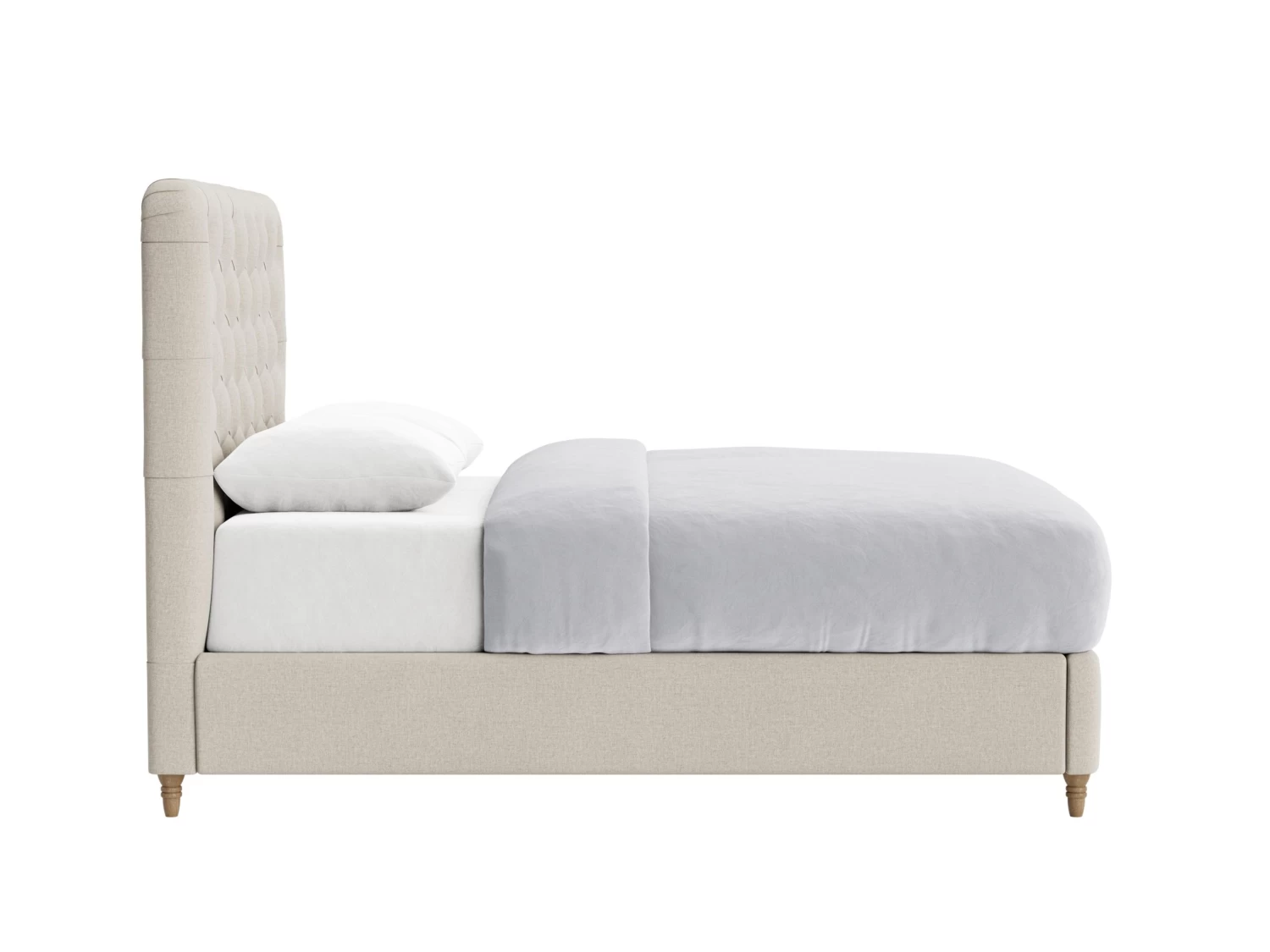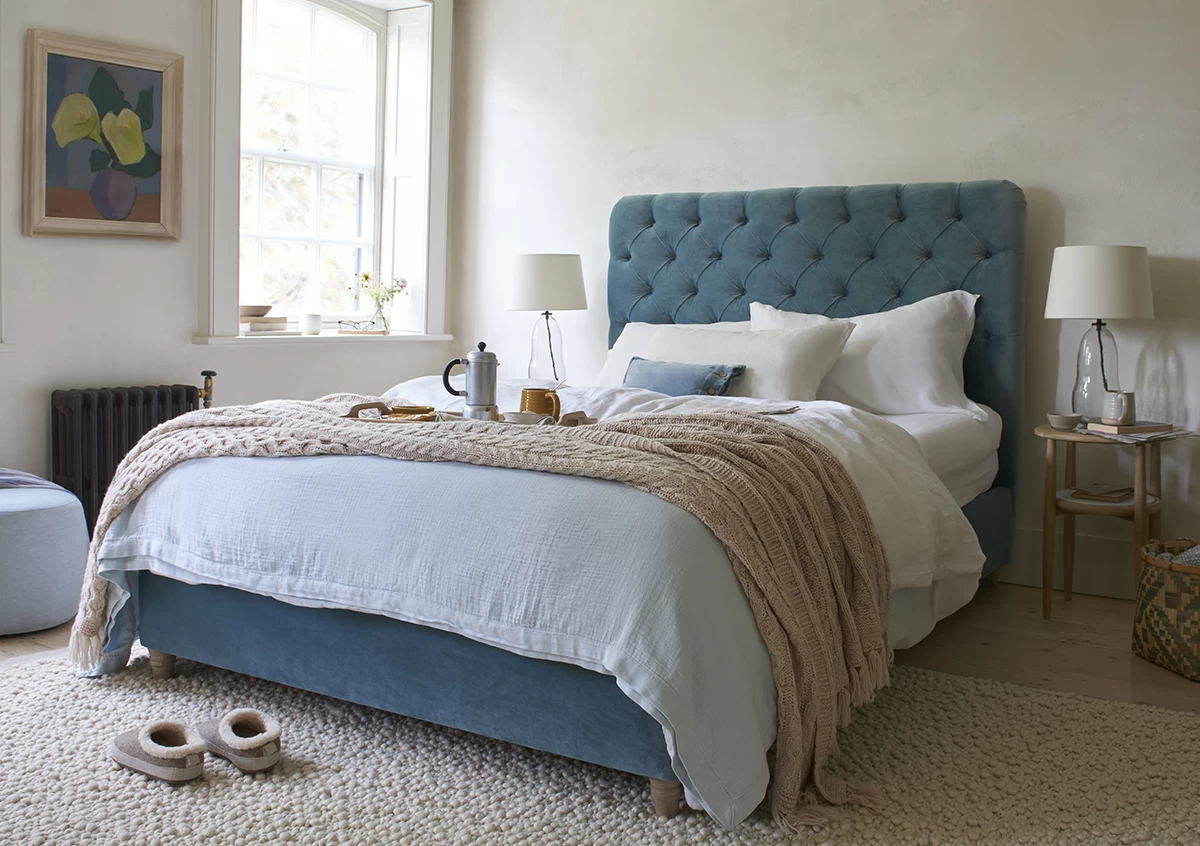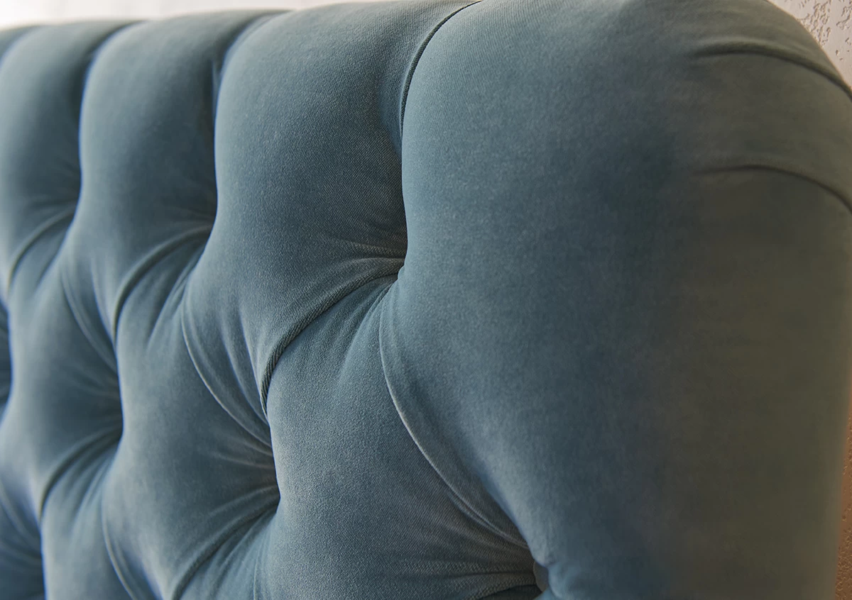 This bed’s grandeur comes from traditional buttons and keeping the headboard fabric slightly relaxed. Job done.