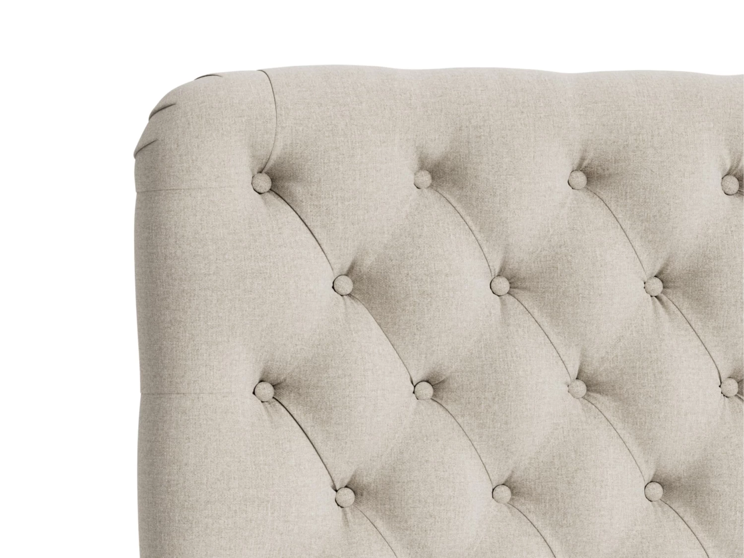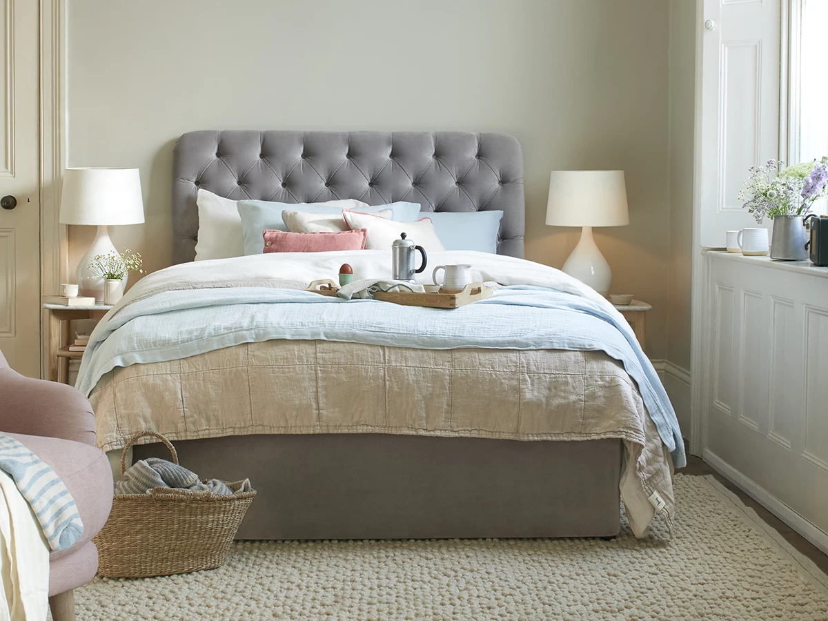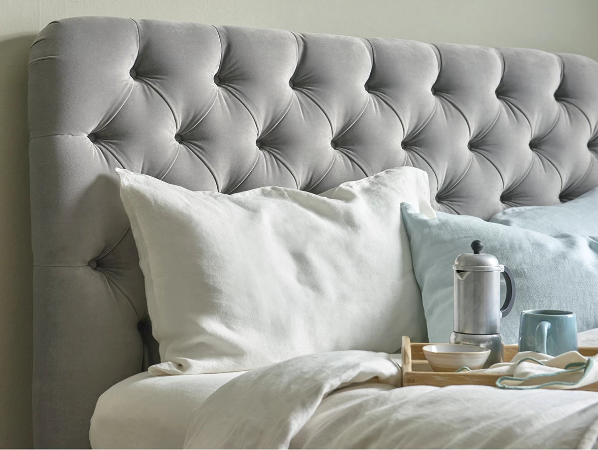 A lovely button back headboard with extra squish for that fresh from the oven feeling.