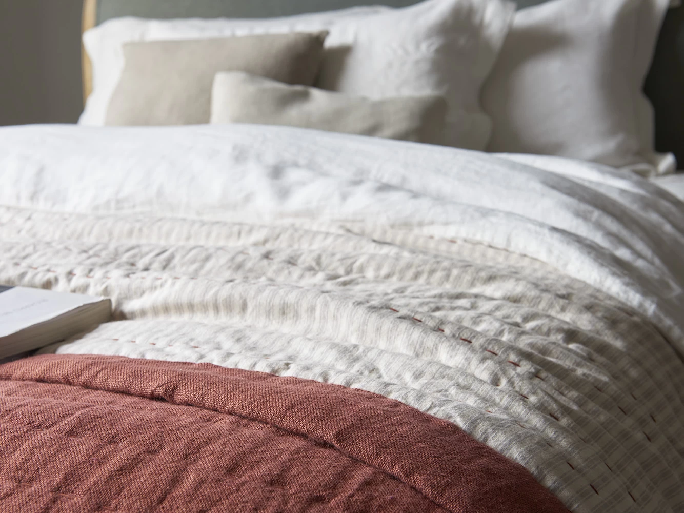 If ever there was a Loafy quilt, this is it. We’ve used a kantha stitch on a lovely relaxed linen. And then backed with a neutral ticking to give it that heirloom, had it ages feel.