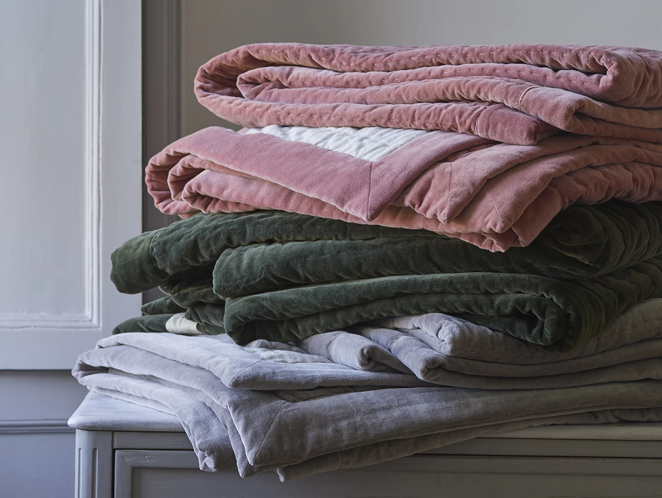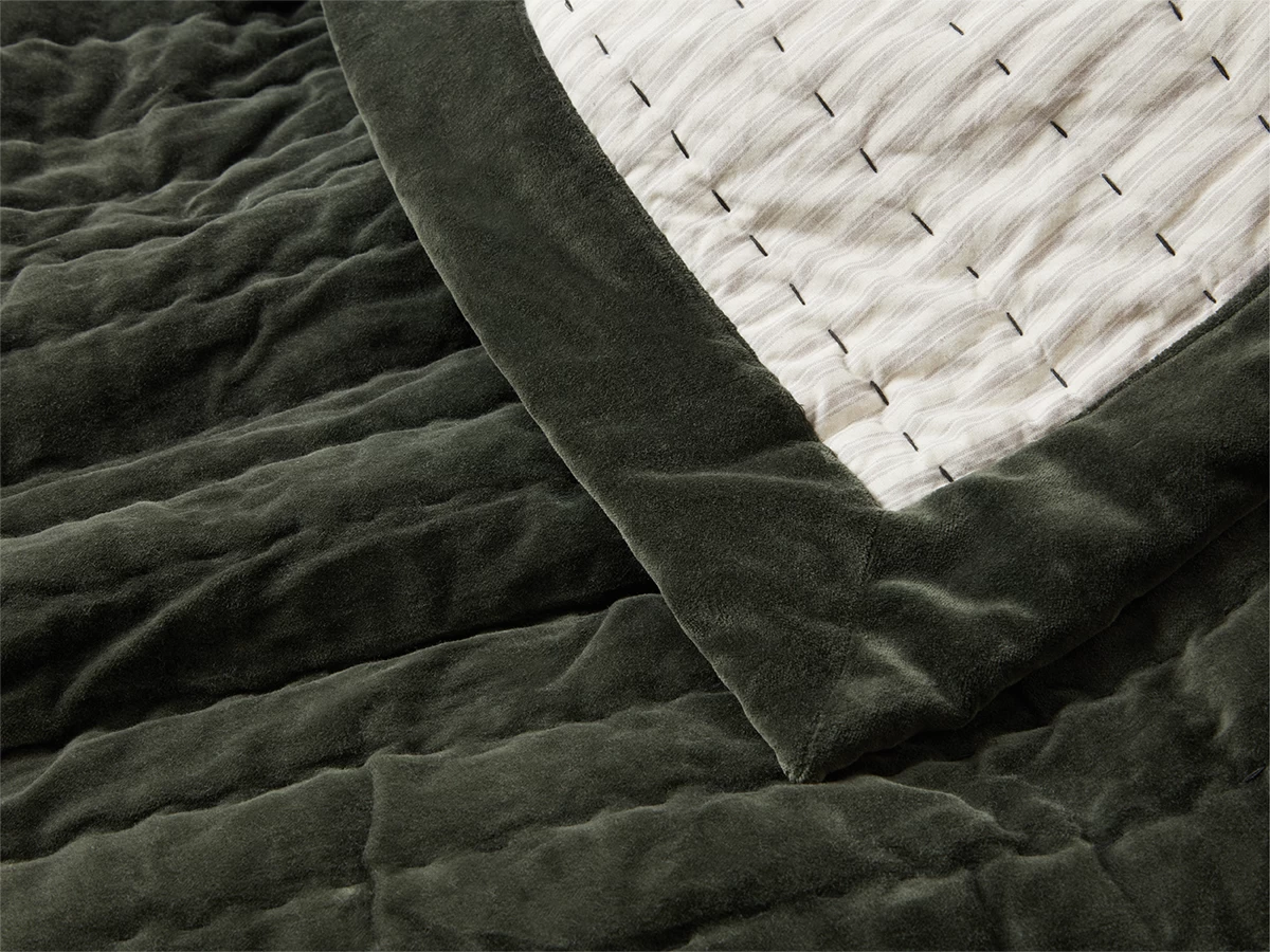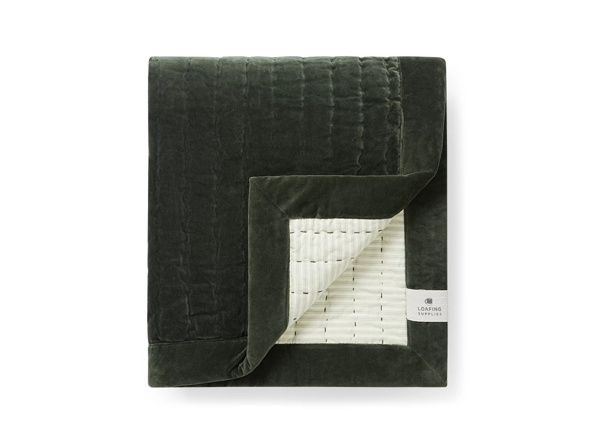 If ever there was a Loafy quilt, this is it. We’ve used a kantha stitch on a lovely dusty velvet. And then backed it with a neutral ticking to give it that relaxed, had it ages feel.