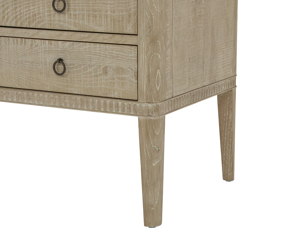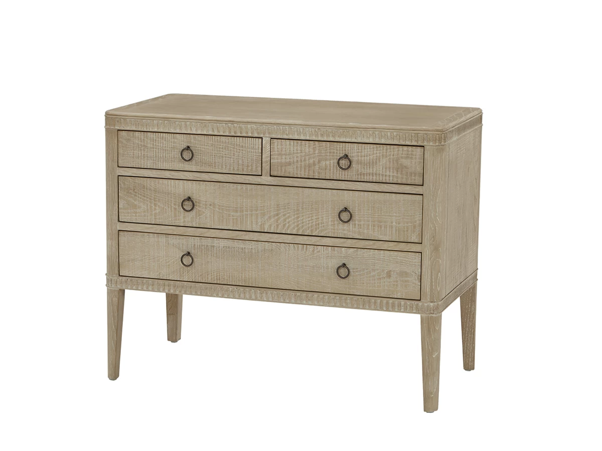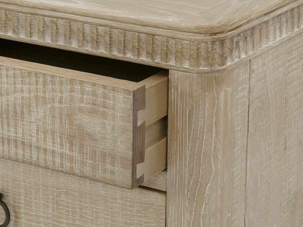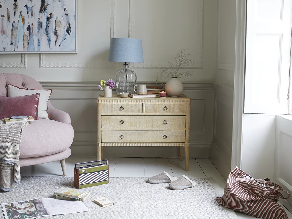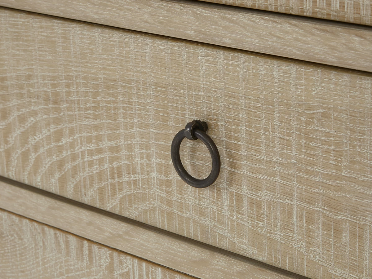 A simple oak chest of drawers with plenty of tasty vintage details, like the carved edges and antique bronze handles.