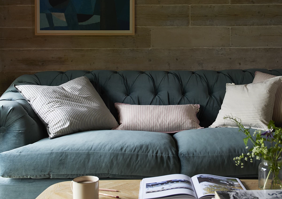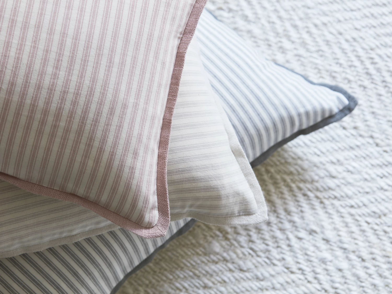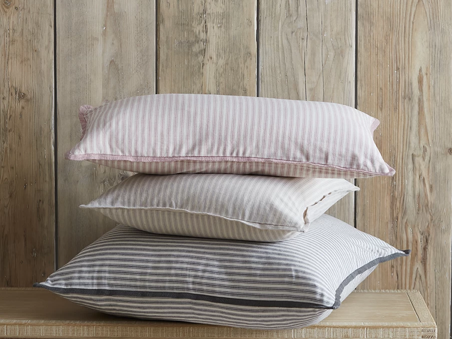 The lovely thing about these classy ticking stripes is that they are so easy to live with. Made in cotton with a washed linen edge.